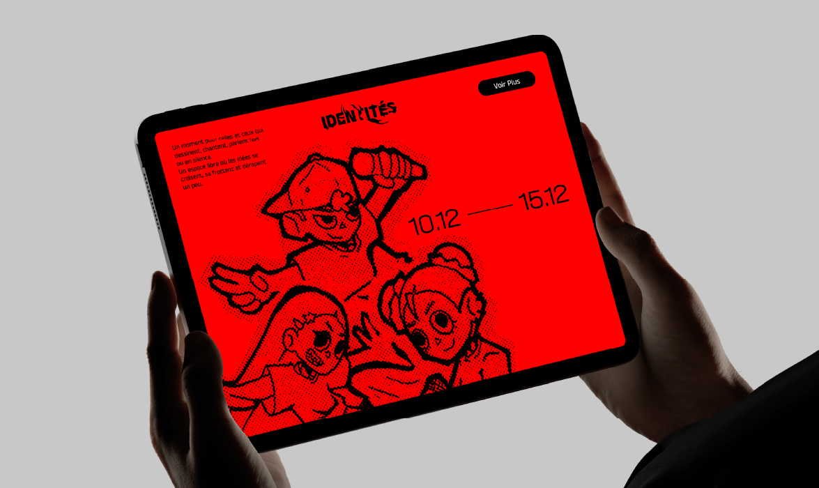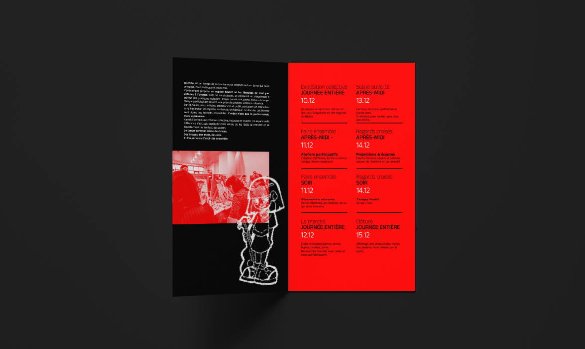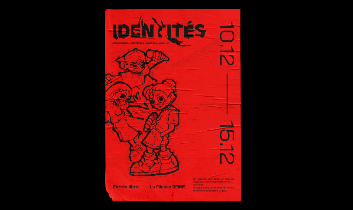 Identité est un temps de rencontres, de performances et de formes visuelles. Un espace ouvert pour celles et ceux qui dessinent, chantent, parlent fort ou en silence. Ici, les idées se croisent, se frottent et dérapent parfois.