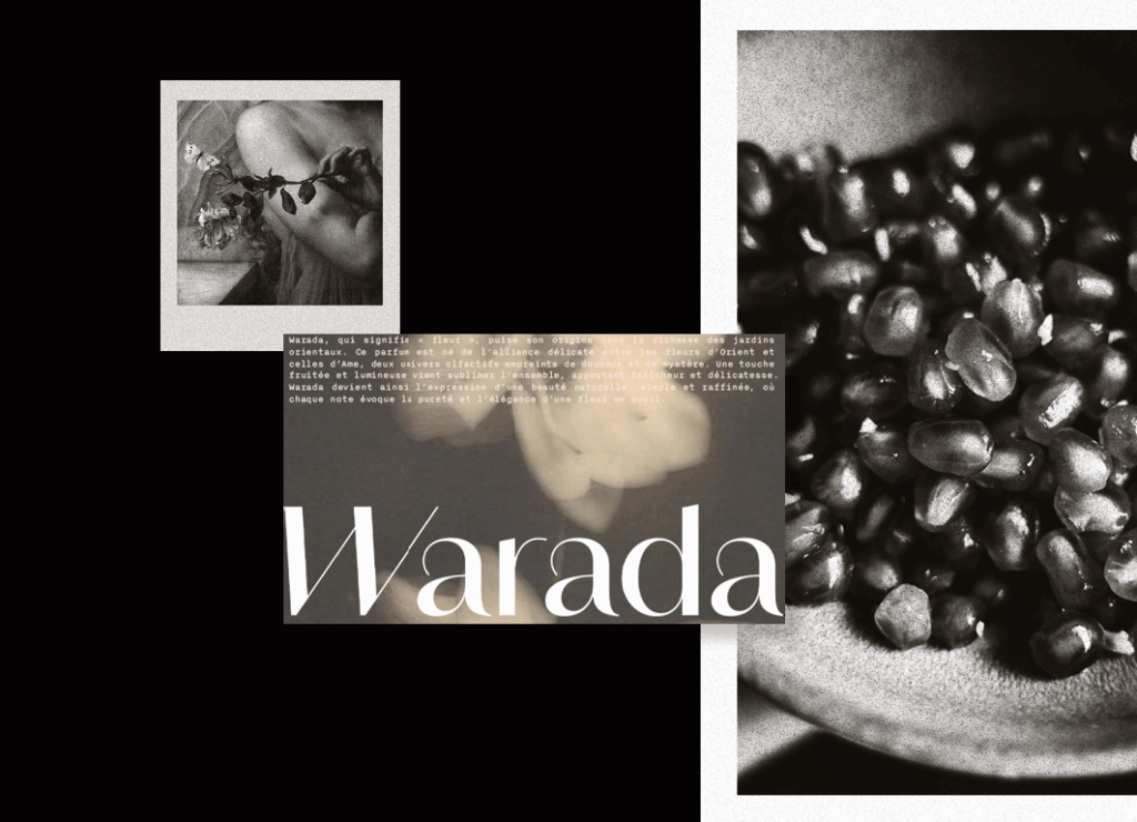 Warada, qui signifie « fleur », puise son origine dans la richesse des jardins orientaux. Ce parfum est né de l’alliance délicate entre les fleurs d’Orient et celles d’Ame, deux univers olfactifs empreints de douceur et de mystère. Une touche fruitée et lumineuse vient sublimer l’ensemble, apportant fraîcheur et délicatesse. Warada devient ainsi l’expression d’une beauté naturelle, simple et raffinée, où chaque note évoque la pureté et l’élégance d’une fleur en éveil.